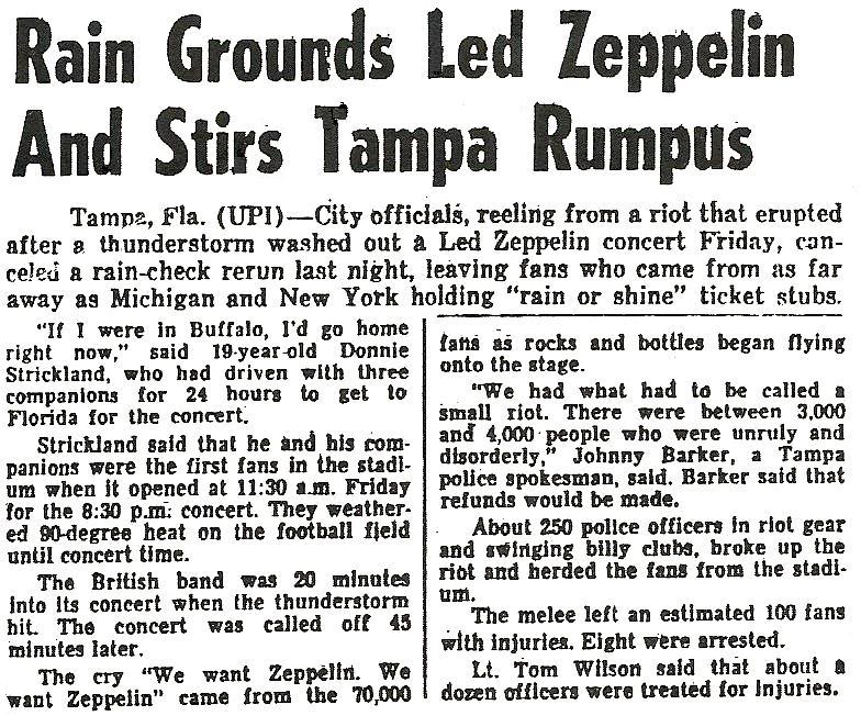 The audience did not take the news well. Amidst chants of “We want Zeppelin,” bottles, cans, stones and even shoes were thrown at the stage. A few thousand rushed the barricade in front of the stage. Some 250 cops in riot gear repelled them and then began to herd unruly fans out of the stadium.