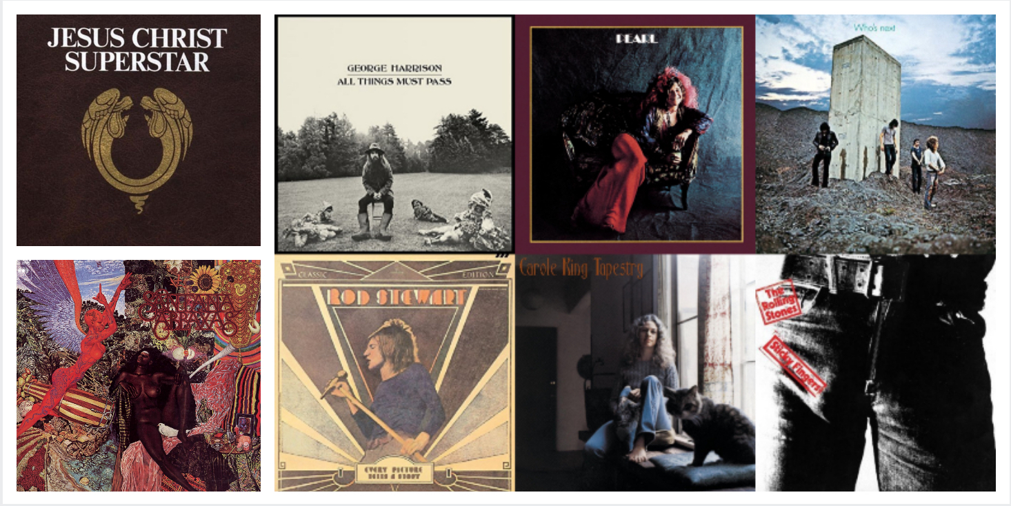 Recordings made by some of the biggest classic rock artists of the era dominated the list of 1971’s top-selling albums in the U.S. The chart, compiled by the former music industry trade magazine, Record World, features several all-time classics among the year’s Top 20 sellers, including legendary albums by Rod Stewart, the Rolling Stones and Carole King, as well as recordings from three members of The Beatles.