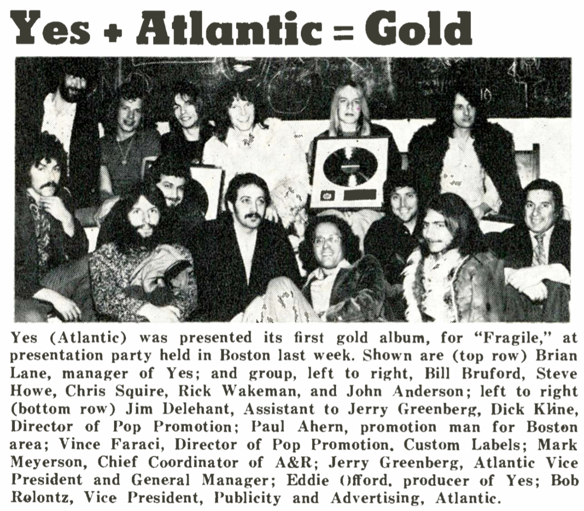 Yes receiving their first Gold Record, for Fragile, in 1972