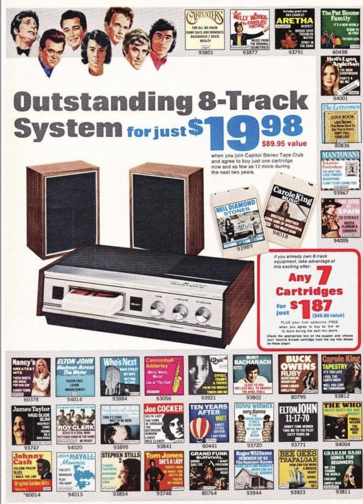 Over the next two years auto companies start to offer the players as a factory installed option, and players for aftermarket installation are introduced. The 8-track becomes the option for listening to albums in vehicles and home players are introduced as a feature on many integrated home stereo systems.