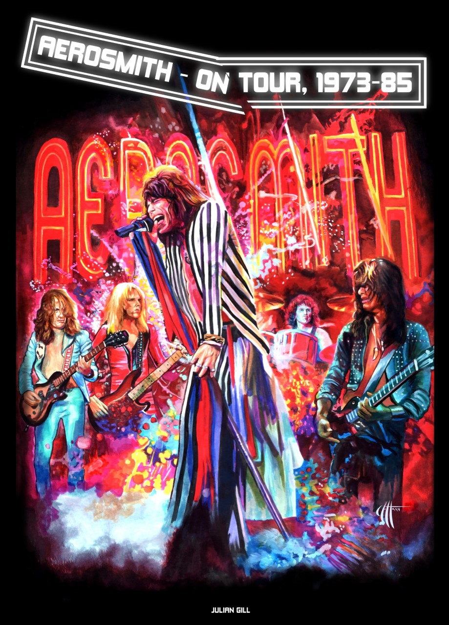 Celebrating the 50th anniversary of the formation of the classic Aerosmith lineup—Steven Tyler, Joe Perry, Brad Whitford, Tom Hamilton and Joey Kramer—a 2022 book, Aerosmith On Tour: 1973-1985, exhaustively chronicles for the first time the band’s career on the road, from early gigs in high school auditoriums and ratty clubs to headlining arenas and stadiums. Written by Julian Gill, Aerosmith On Tour: 1973-1985 unveils its tale via local reviews, eyewitness reports, press accounts and interviews with key insiders.