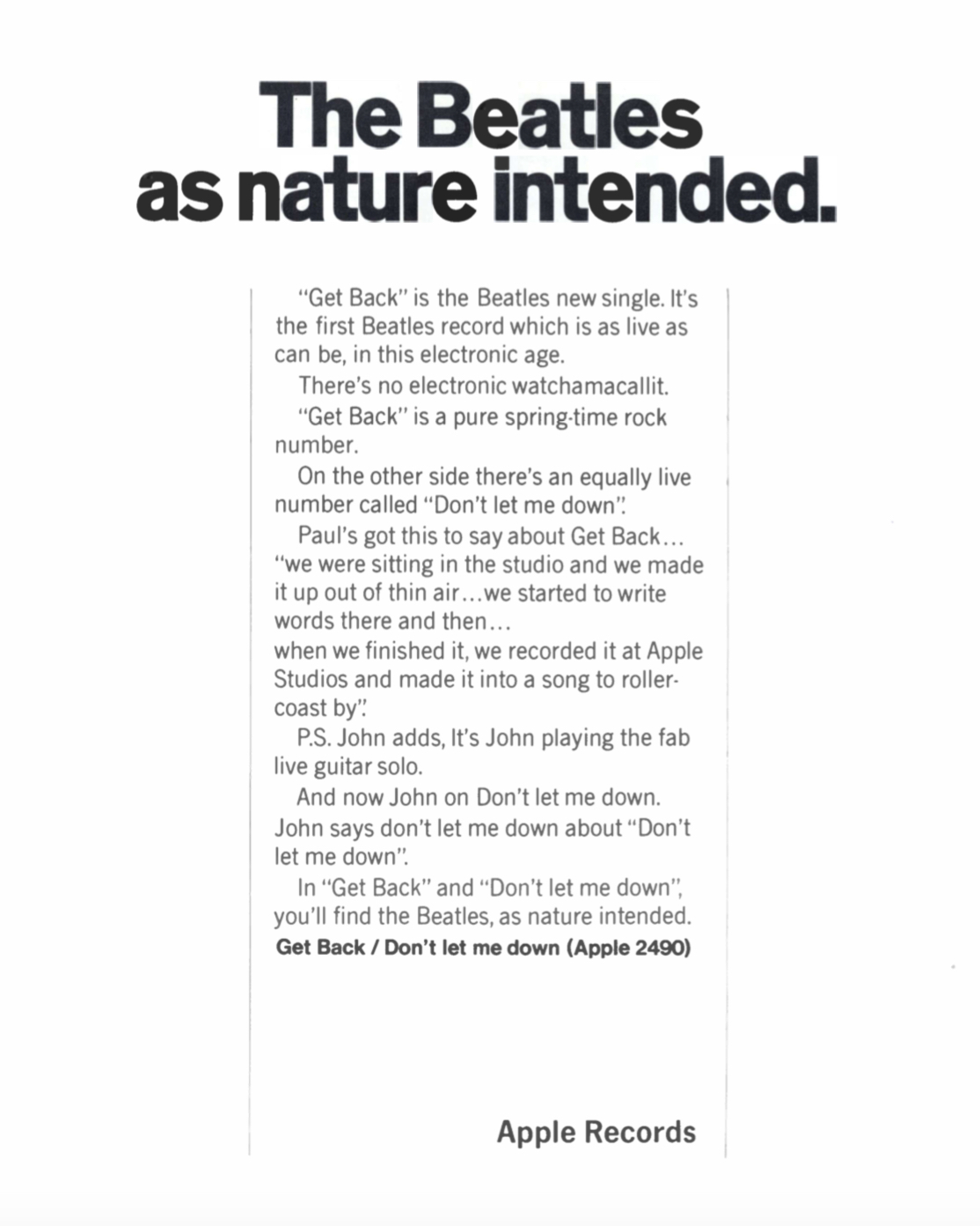 This ad for “Get Back” appeared in the April 26, 1969 issue of Record World