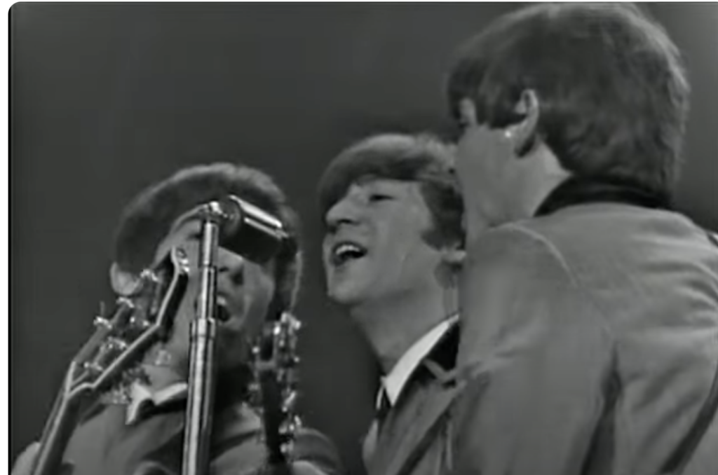 They opened, charmingly, with a cover of Chuck Berry’s “Roll Over Beethoven,” George Harrison singing lead. This strikes us as amusing now: First U.S. show, and Harrison kicks it off? We must remember that the Beatles weren’t sure how long they were going to last. Everything that was happening over the course of these days must have registered to them as surreal and likely temporary. How could any such thing be sustained? You want to make a good impression, though, and America was the land of the man we might call Mr. Maybellene, so why not serve the Americans something of their own?