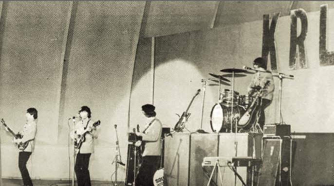 The Beatles perform at Hollywood Bowl in Los Angeles, California on 29 August 1965. (Photo