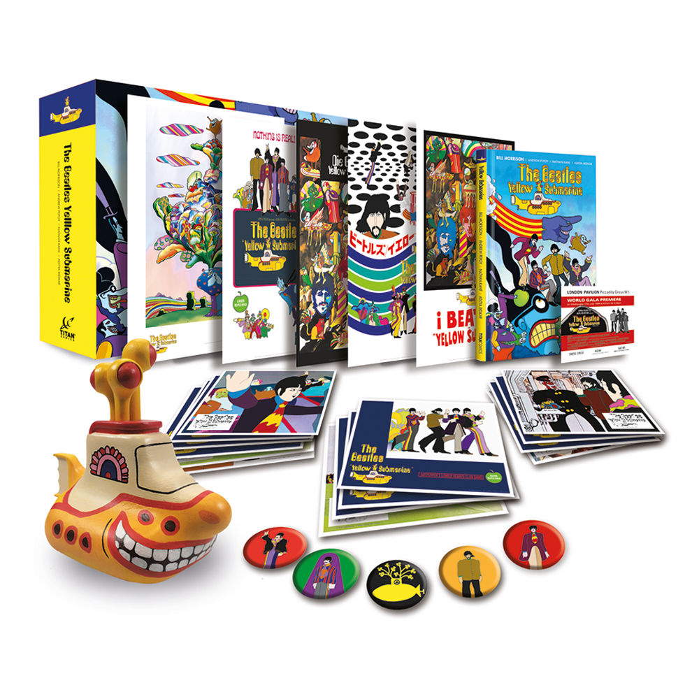 The Beatles Yellow Submarine Limited Edition Box Set contains the following items, as described on the Beatles store: the Yellow Submarine graphic novel, a 6.5-inch Yellow Submarine vinyl figurine, 16 Yellow Submarine lobby cards plus four Yellow Submarine posters (based on the originals), five Beatles badges, a replica Yellow Submarine movie premiere ticket, and an exclusive art card signed by Bill Morrison. The set is lavishly presented in a beautifully illustrated box.