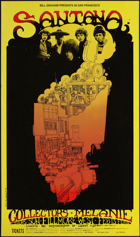 Carlos was in 1967. I had the Fillmore in San Francisco, and Paul Butterfield was playing. My office was right above the marquee. There were windows over the marquee and you had to go through that door in my office on the second floor to change the lettering. Anyway, I’m sitting in my office in the middle of the night and heard some noises outside my window. I went to the window to look outside and there are two guys who climbed up a rain pipe to get to the second level to get it. It was Carlos and Michael Carabello, who was a conga player friend of his.