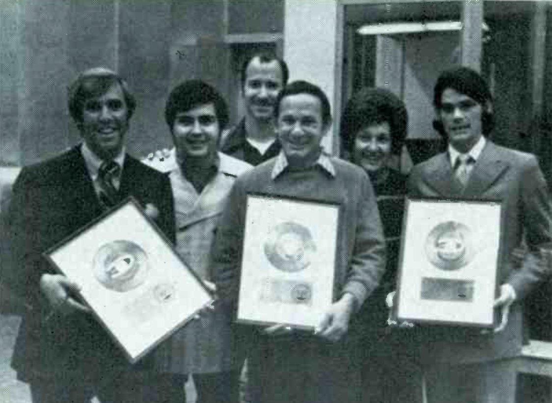 Celebrating 2 million in sales for “Raindrops” in 1970 (L-R): Bacharach, Tyrell, Scepter EVP Sam Goff, David, Greenberg and Thomas.