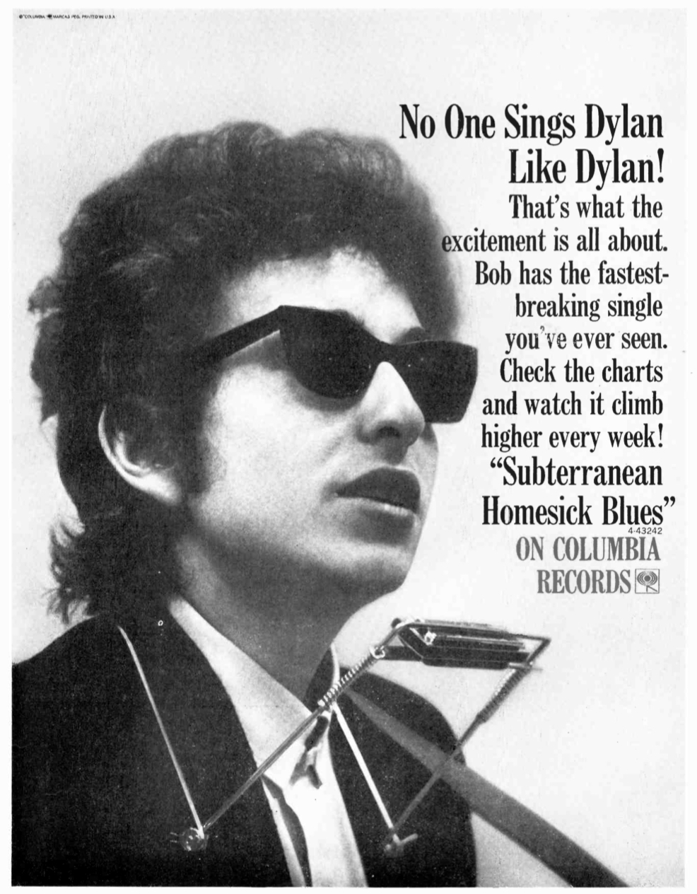The ad’s headline—No One Sings Dylan Like Dylan!—perhaps referred to the success that Peter, Paul and Mary had with their cover of his “Blowin’ in the Wind,” which reached #2 in 1963. (Dylan’s original, from The Freewheelin’ Bob Dylan, had failed to chart.)