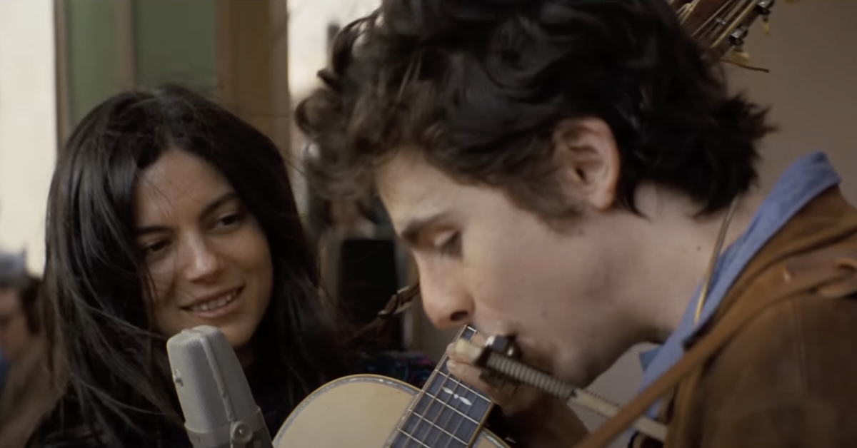 Monica Barbaro (as Joan Baez) and Timothée Chalamet (as Bob Dylan) in 2024’s A Complete Unknown