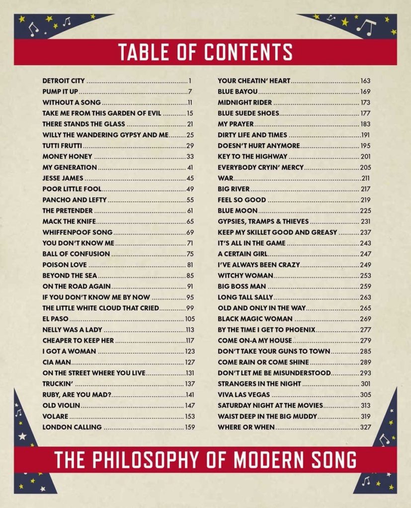 Like that volume, Dylan’s 2022 entry has a title that makes it sound like a textbook. It’s certainly not, nor does it really deliver what the title suggests. Rather, it includes quirky, opinionated essays on 66 songs from multiple genres and decades, some well-known, some obscure—among them Carl Perkins’ “Blue Suede Shoes,” Vic Damone’s “On the Street Where You Live,” the Who’s “My Generation,” Tommy Edwards’ “It’s All in the Game” and the Grateful Dead’s “Truckin’.” Also: Nina Simone’s “Don’t Let Me Be Misunderstood,” Elvis Costello’s “Pump It Up,” Marty Robbins’ “El Paso,” the Allman Brothers’ “Midnight Rider,” Little Richard’s “Tutti Frutti” and the Platters’ “The Great Pretender.” Bobby Darin shows up twice, with “Mack the Knife” and “Beyond the Sea.” So do Elvis Presley, with “Money Honey” and “Viva Las Vegas,” and Johnny Cash, with “Big River” and “Don’t Take Your Guns to Town.”