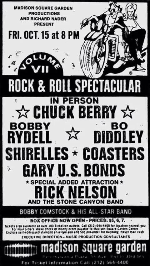 The live album proved something of a fluke though, and when, in 1971, he received an invitation from a New York City-based concert promoter named Richard Nader—then building an empire by staging “revival” shows that reunited long-gone early rock ’n’ roll and doo-wop groups and brought back stars of the past—to perform at Madison Square Garden, Nelson happily accepted. There, on Oct. 15, he and the Stone Canyon Band would serve as the “Special Added Attraction” on the Rock & Roll Spectacular Volume VII program, which also featured Chuck Berry, Bo Diddley, the Shirelles, the Coasters, Bobby Rydell and Gary U.S. Bonds. Nelson, who by then sported period-appropriate long hair and dressed in the contemporary style (purple velvet shirt and bell bottoms!), having outgrown his boyish, all-American look of the ’50s and early ’60s, prepared a set that included some of his old hits but also songs from his then-current country-rock repertoire.