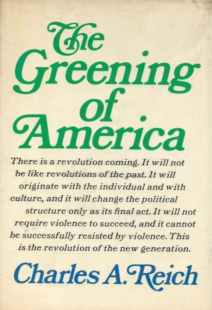 The Greening of America—Charles A. Reich’s 1970 book advertised its intentions right on its front cover, under the title, where it proclaimed, “There is a revolution coming. It will not be like revolutions of the past…This is the revolution of the new generation.” Like many, Reich believed that a fundamental change was brewing, one that would not just remake society but human consciousness. While it was idealist in nature, it was not bleary-eyed; he made his case that new values would emerge and take us into a saner future. To what extent that occurred is debatable, but at the time Reich’s words resonated with many.
