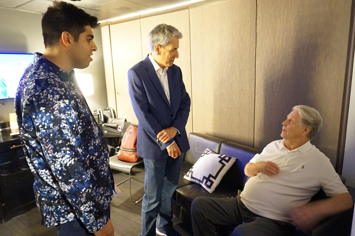 UCLA student David Ghesser and UCLA adjunct professor David Leaf speak with legendary songwriter Brian Wilson, co-founder of the Beach Boys. (Photo courtesy of UCLA)