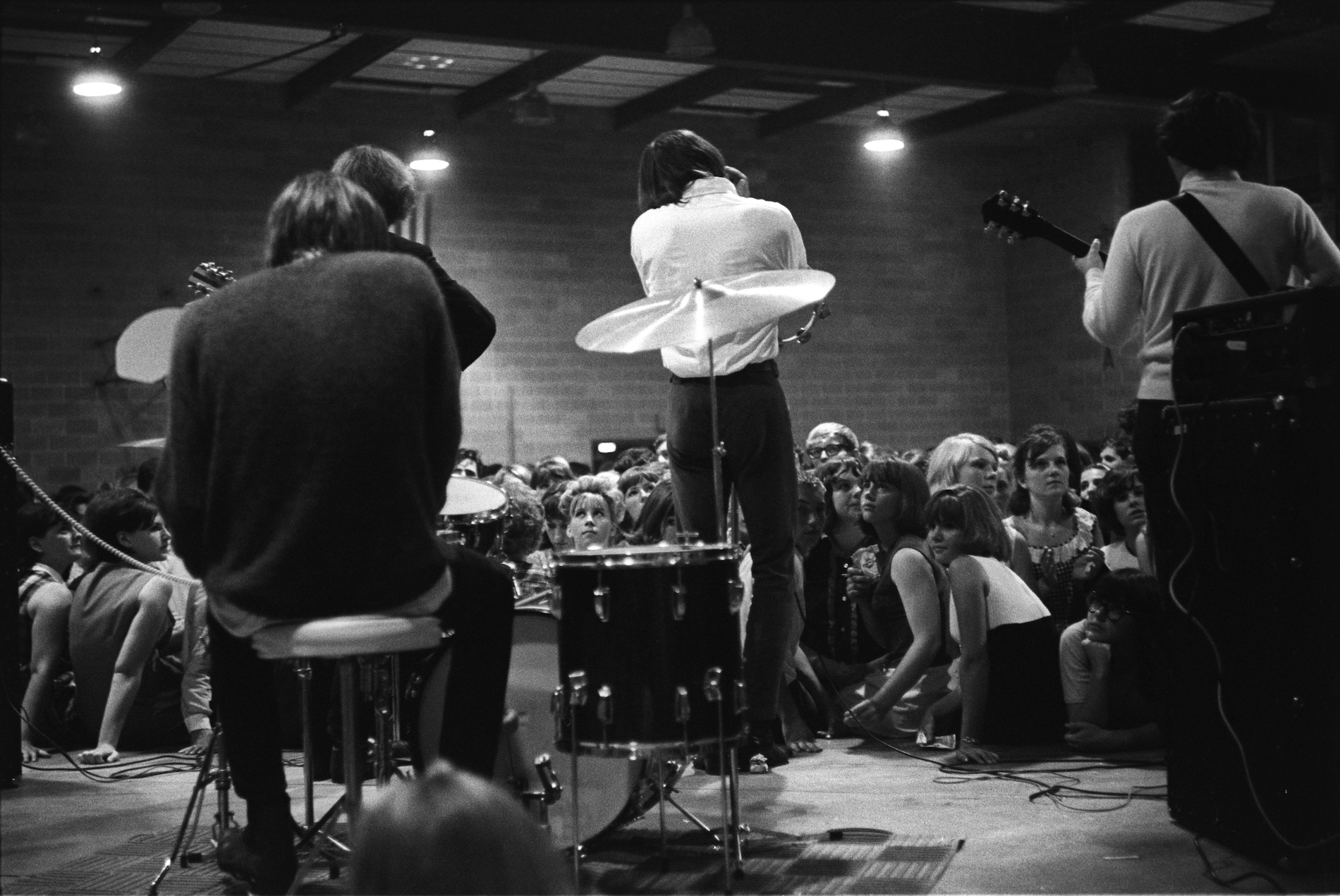The Byrds at a recording session in Los Angeles, California, January 28, 1965. From left: Jim McGuinn (later referred to as Roger McGuinn), Chris Hillman, Gene Clark, David Crosby and Michael Clarke on drums. (Photo by CBS via Getty Images; used with permission by BMG Books)