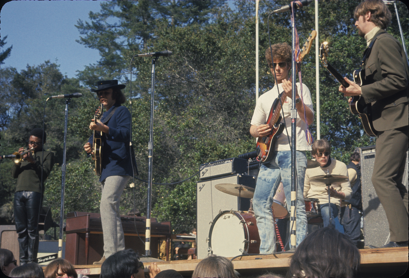 From ‘The Byrds: 1964-1967‘ book (Photo via BMG Books) The group (l. to. r.: David Crosby, Chris Hillman, Michael Clarke, Roger McGuinn) is joined onstage by South African jazz trumpeter Hugh Masekela (left)