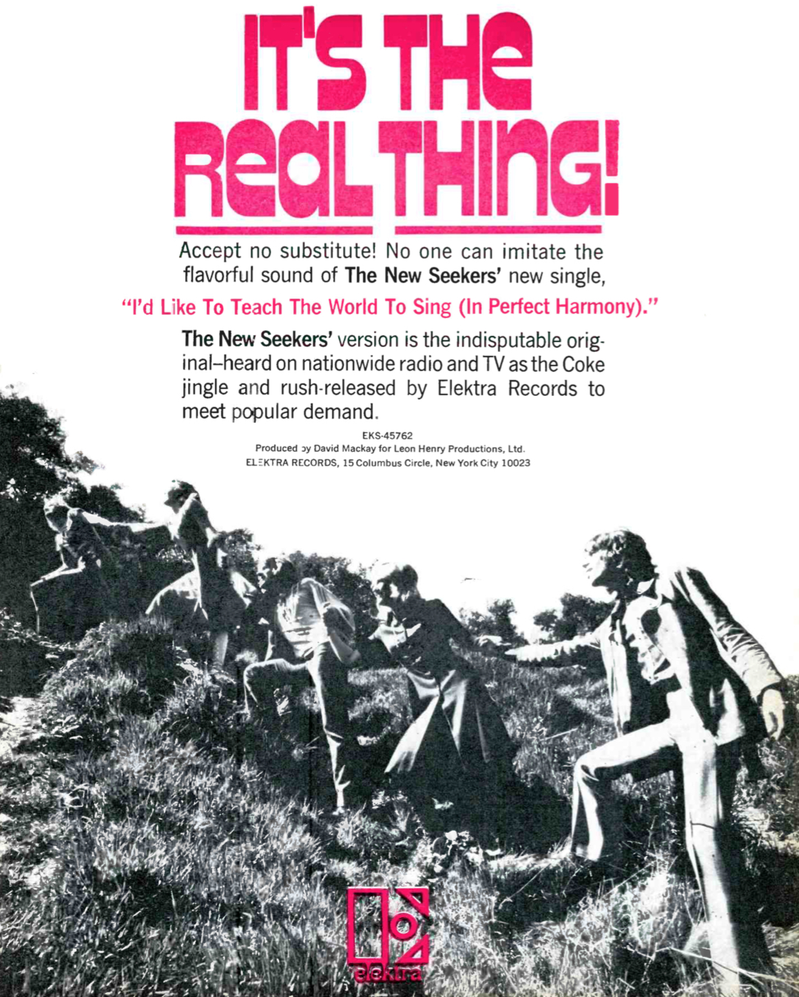 “It’s The Real Thing!,” blared an ad by their label, Elektra, in the Nov. 20 issue of Record World. “Accept no substitute. No one can imitate the flavorful sound of the New Seekers’ new single.”