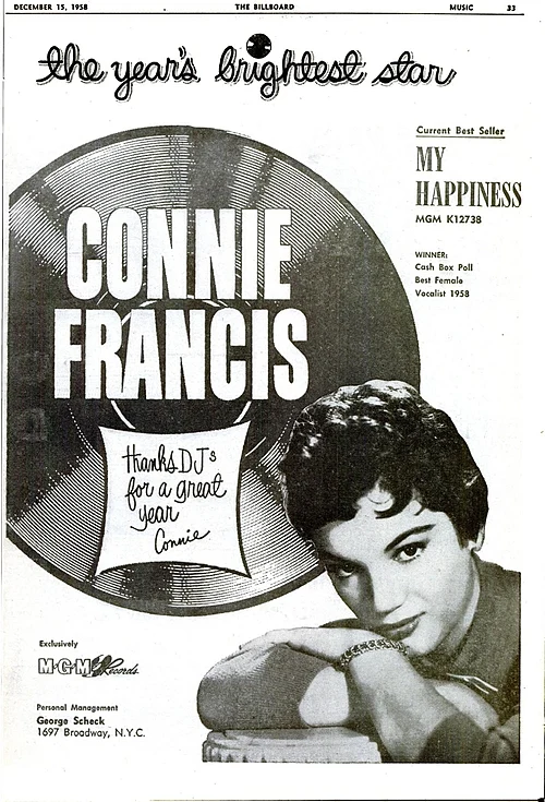 Connie Francis was born Concetta Rosa Maria Franconero in Newark, N.J., on Dec. 12, 1937. As a child, she entered talent contests as an accordionist and singer and was featured on the Arthur Godfrey’s Talent Scouts radio and TV program in 1950. After graduating high school in 1955 she recorded a series of demonstration records, then signed with MGM Records that same year. She didn’t hit the charts until 1957, when a duet with country singer Marvin Rainwater, “The Majesty of Love,” scraped the bottom of the top 100. But her next release, a cover of the 1923 song “Who’s Sorry Now,” also in 1957, rose to #4 and established Francis as a new star.