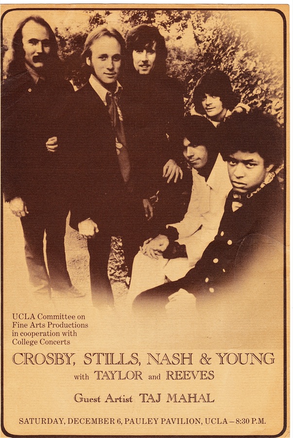 Nash, Crosby, Stills and Young, with drummer Dallas Taylor (L) and bass guitarist Greg Reeves (R) in August 1969 (Photo © Henry Diltz; used with permission)