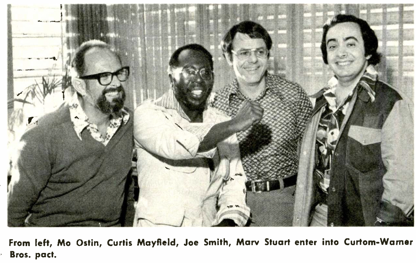 Curtis Mayfield is pictured with Warner Bros. Records’ top execs, Mo Ostin and Joe Smith, in late 1974