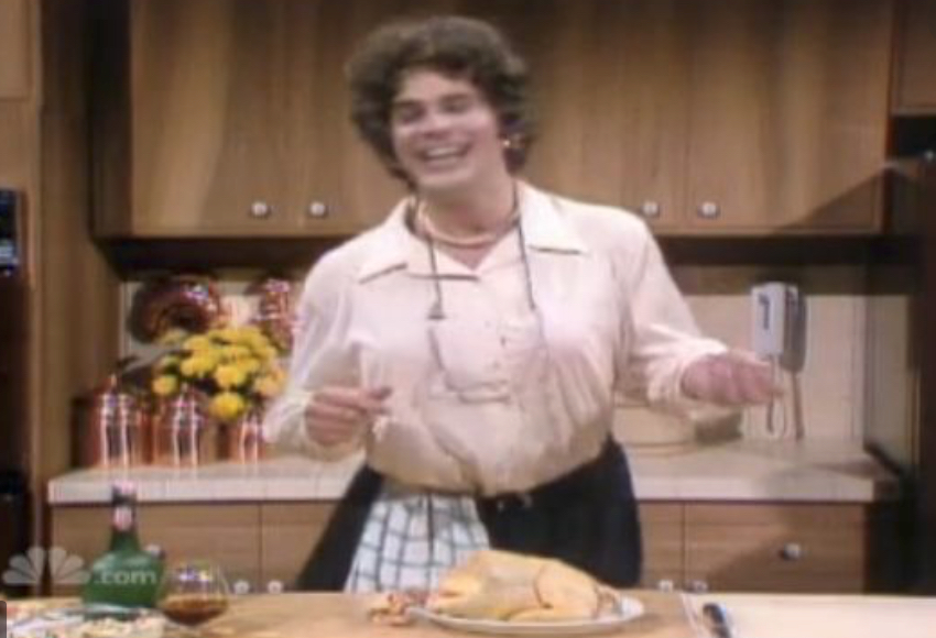 Aykroyd, mimicking Child’s over-the-top high-pitched voice, tells the audience that he’s going to teach them how to prepare a holiday feast with “a fine, fat roasting chicken like this one.”