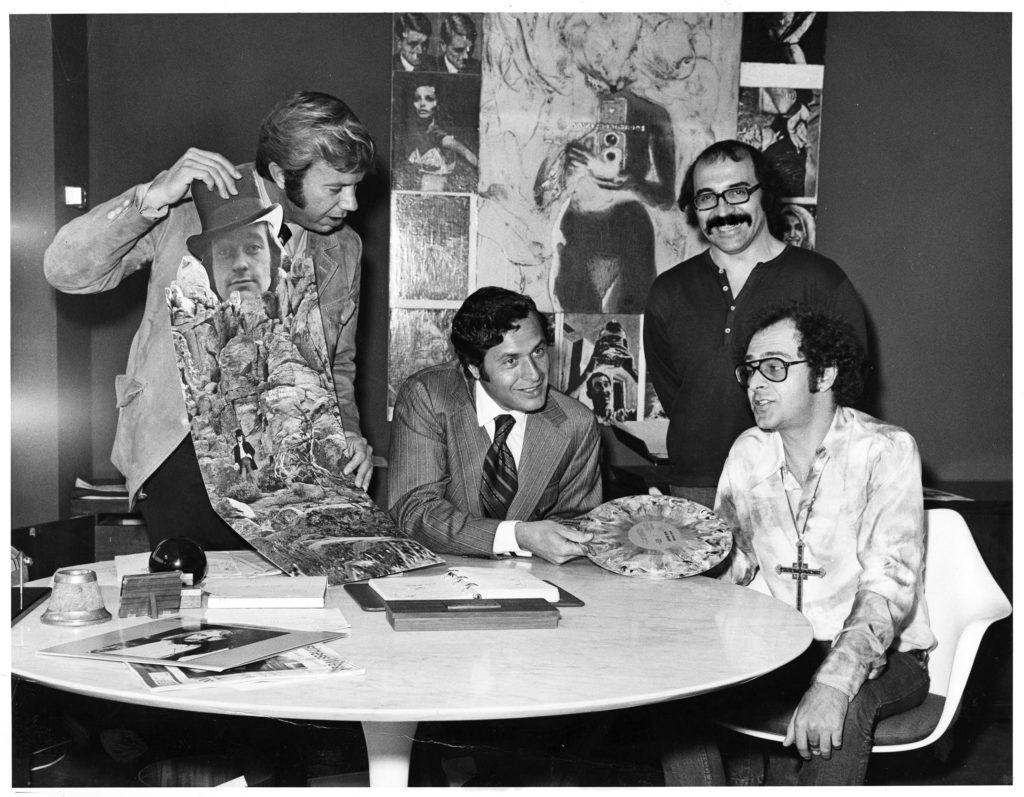l. to r.: unidentified person, Sal Ianucci, Tommy LiPuma and Bob Krasnow admire Dave Mason’s Alone Together (Photo courtesy of Ben Sidran)