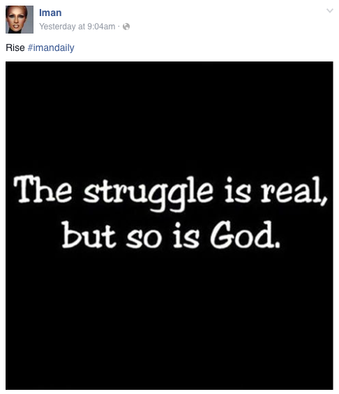 On Sunday, before the performer’s death was announced, his wife, Iman, had made some cryptic posts on social media. On her Facebook page, she wrote “Rise #imandaily,” followed by a stark message of white letters against a black background: The struggle is real, but so is God.
