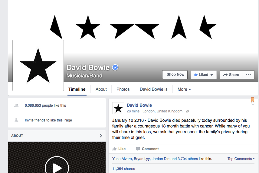 The social media world was abuzz in the middle of the night Monday, January 11, 2006, with three simple, shocking words: David Bowie Dead. The news stemmed from the classic rock legend’s own Facebook page: