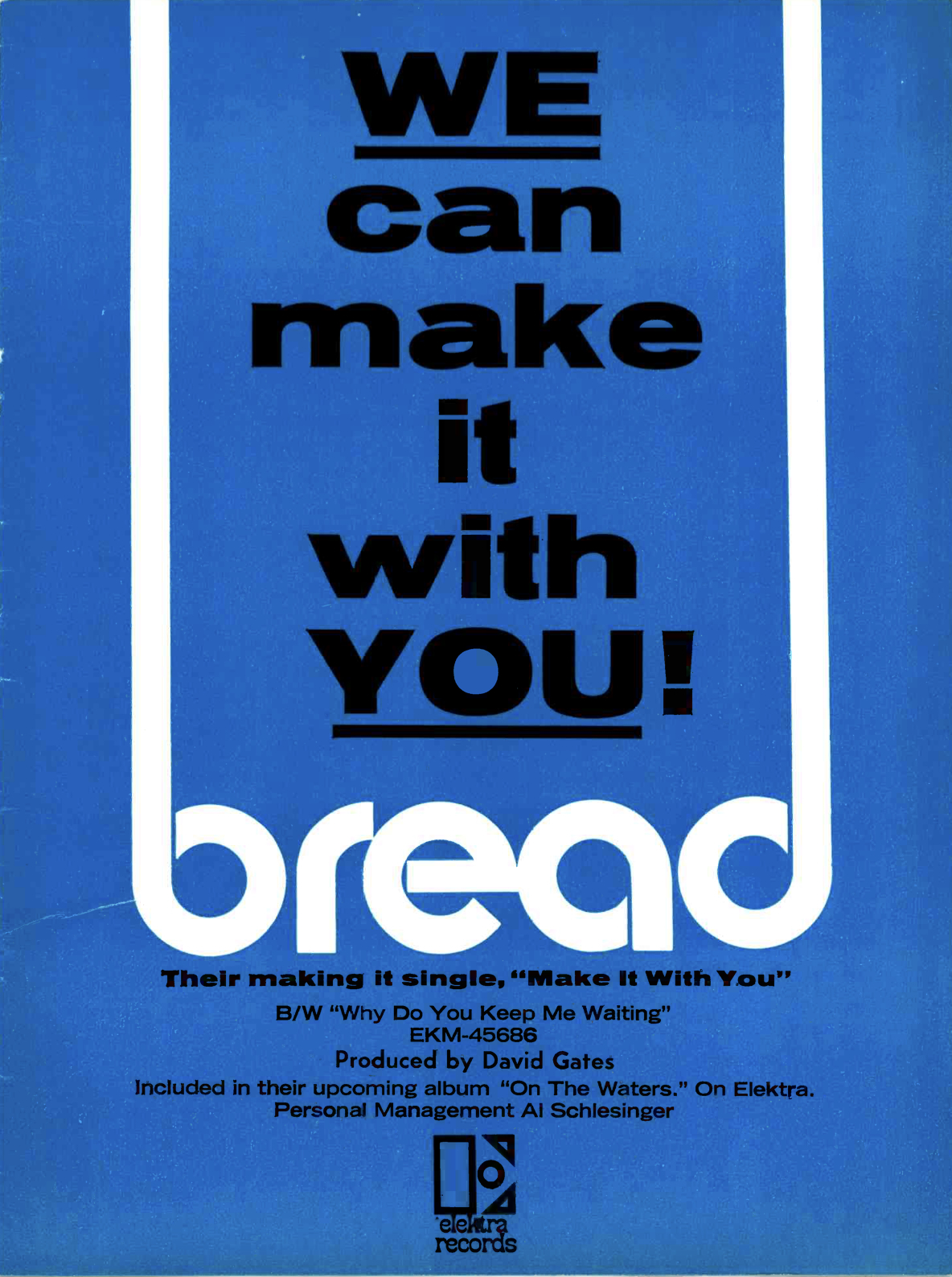 If you were listening to Top 40 radio in the U.S. throughout the ’70s, chances are you’d hear a song by the band with the bland name Bread. The group, fronted by David Gates, their songwriter, producer and primary guitarist and vocalist, earned six Top 10 singles on the Hot 100 including the soft-rock favorites “Baby I’m-a Want You,” “If” and the 1970 #1 hit, “Make It With You.”
