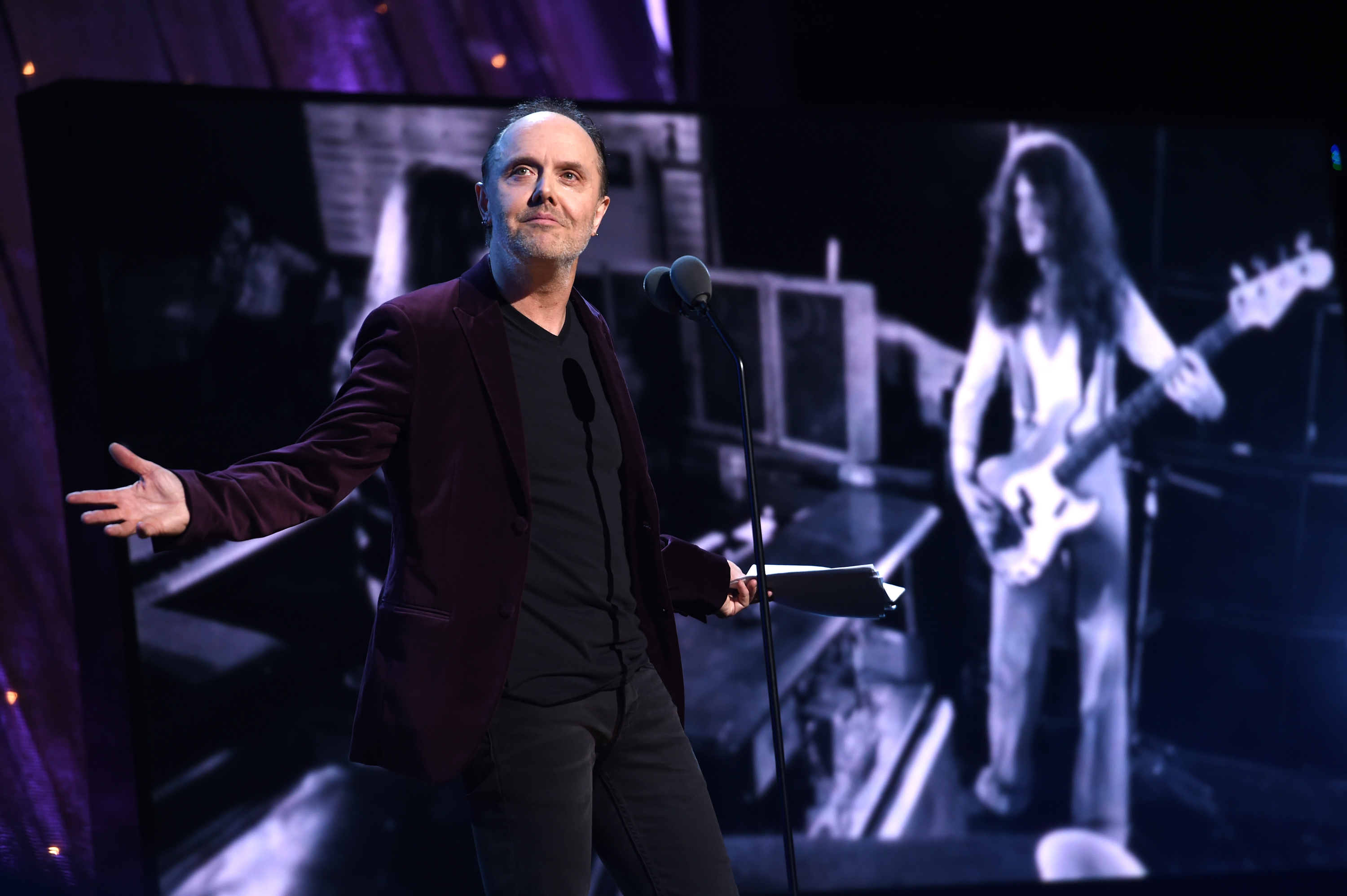 Lars Ulrich of Metallica inducts Deep Purple onstage at the 31st Annual Rock Hall Induction Ceremony at Barclays Center in Brooklyn, NY on April 8, 2016 (Photo: Dimitrios Kambouris/WireImage for Rock & Roll Hall of Fame; used with permission)