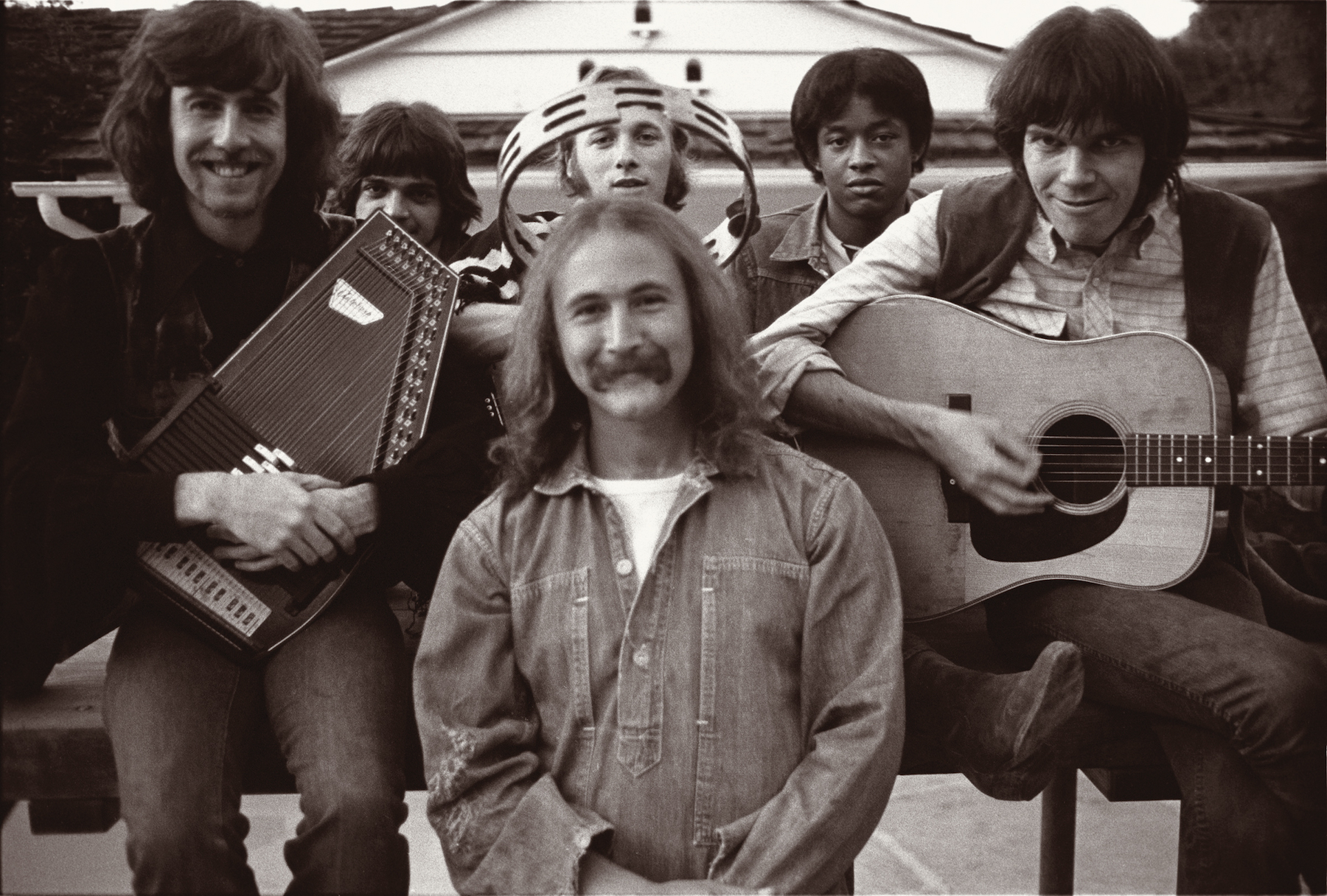 Nash, Taylor, Crosby, with Stills behind him, Reeves, and Young (Photo © Henry Diltz; used with permission)