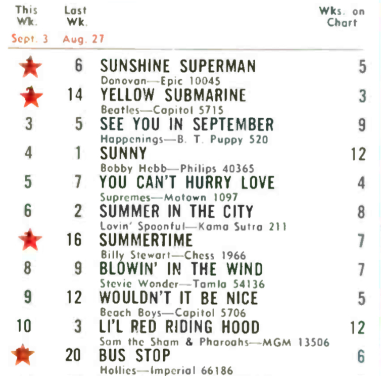 Look at the great singles “Sunshine Superman” passed on the way to the top of the Record World chart on September 3, 1966.