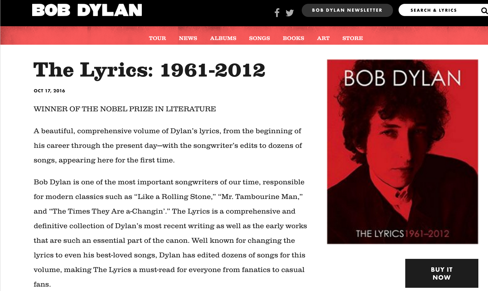 All of which leads to today’s news: Dylan has finally, almost, said thanks. On his website (see above photo), which previously made no mention of the prize since it was awarded last week, there is now a headline that reads: