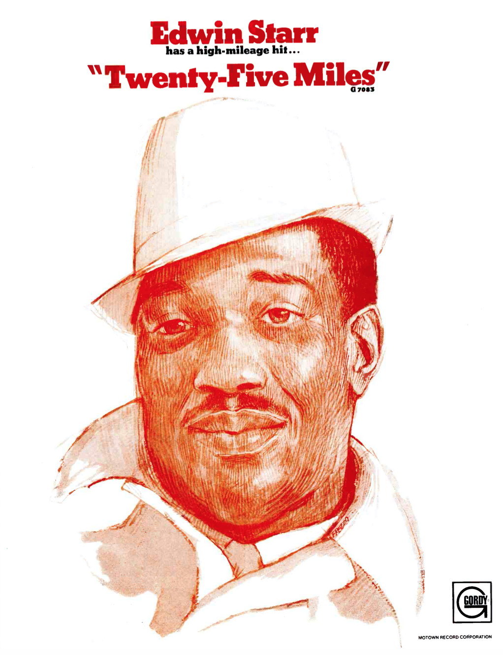 “Agent Double-O-Soul” had been released on the indie Ric-Tic label and found its way to #21 nationally, but Starr truly found his groove on the later dance track: “Twenty-Five Miles” was co-written by Johnny Bristol, Harvey Fuqua (formerly of the Moonglows) and Starr, but it was so close in structure and content to an earlier composition called “32 Miles Out of Waycross” that the writers of that song, Bert Berns and Jerry Wexler, were ultimately added on to the list of authors of the Gordy label release of “Twenty-Five Miles.” A true feel-good tale of longing and desire, the song’s lyrics counted down the distance remaining as the singer, traveling by foot, inched closer and closer to his love.