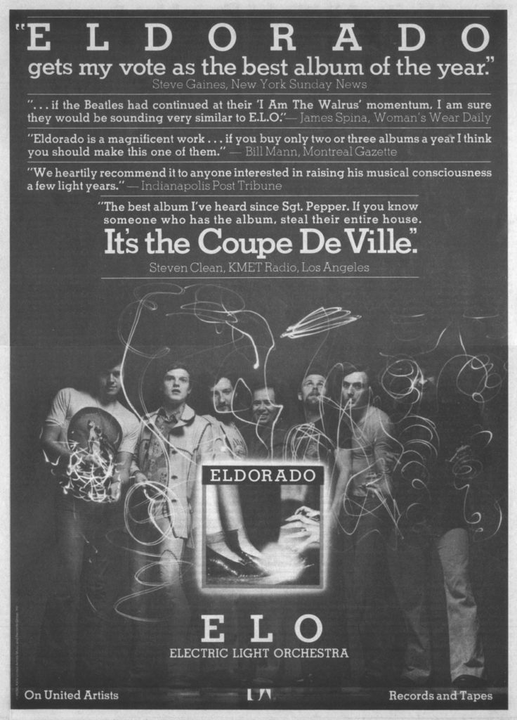 For ELO’s fourth record, Lynne made an important refinement. Where preceding records had built orchestral sections with overdubs, Lynne opted to live up to the band’s name when he hired Louis Clark as string arranger and utilized a full orchestra in the group’s recordings. That approach paid immediate dividends with Eldorado, the ambitious September 1974 release that enhanced the group’s popularity worldwide and refined an approach that would bear fruit for years to come.