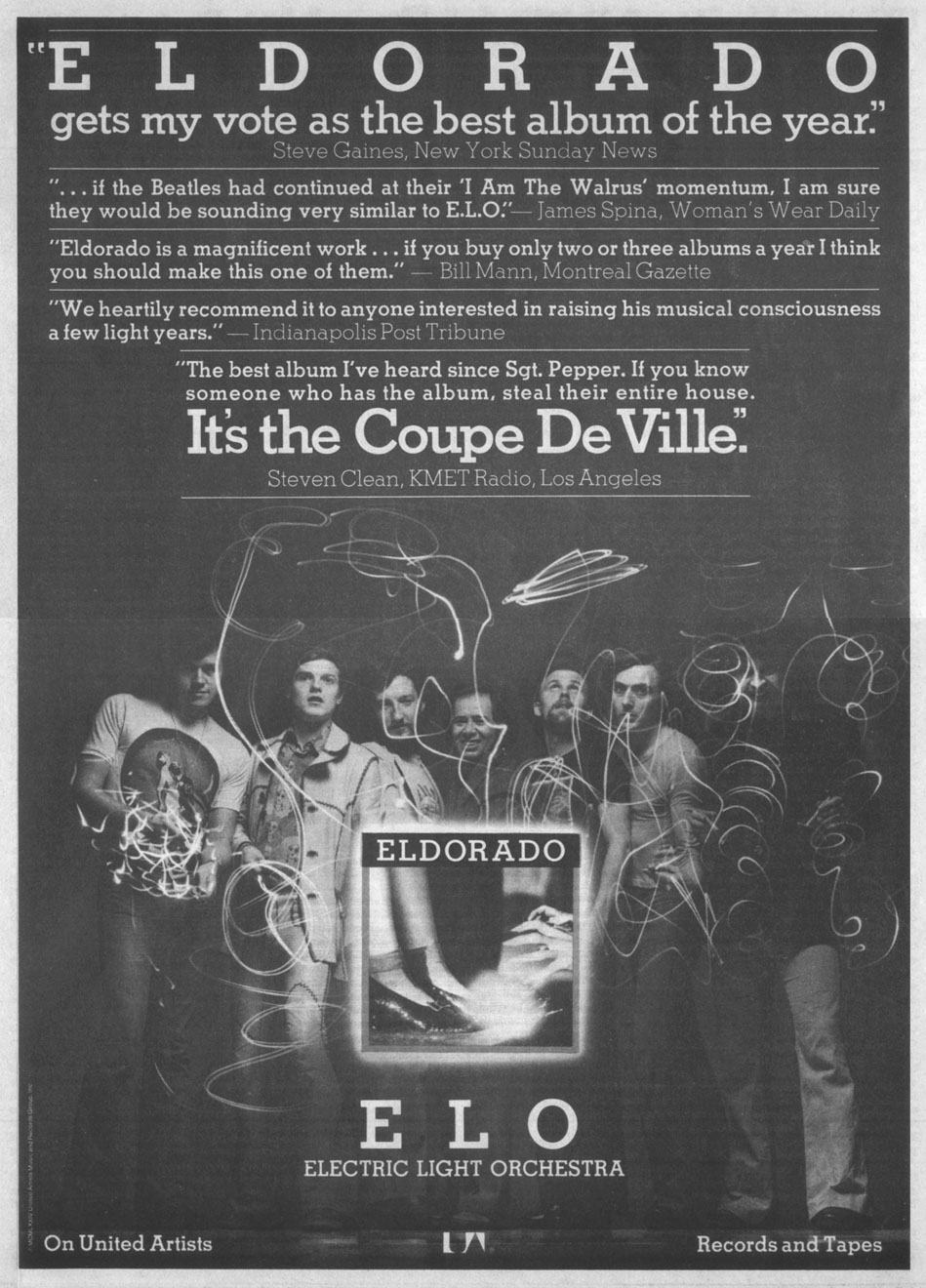 For ELO’s fourth record, Lynne made an important refinement. Where preceding records had built orchestral sections with overdubs, Lynne opted to live up to the band’s name when he hired Louis Clark as string arranger and utilized a full orchestra in the group’s recordings. That approach paid immediate dividends with Eldorado, the ambitious September 1974 release that enhanced the group’s popularity worldwide and refined an approach that would bear fruit for years to come.