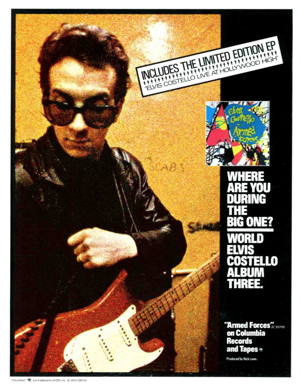 [From Record World‘s reporting: While the scope of its success may have been a surprise to some, it did not come as a surprise to Columbia Records. The album was the subject of an in-depth marketing and merchandising campaign engineered by Costello’s manager, Jake Riviera, and the label’s marketing exec Dick Wingate. An important factor in the album’s out of the box success was the inclusion of the “Live at Hollywood High” ep in the first 200,000 copies of the LP.]