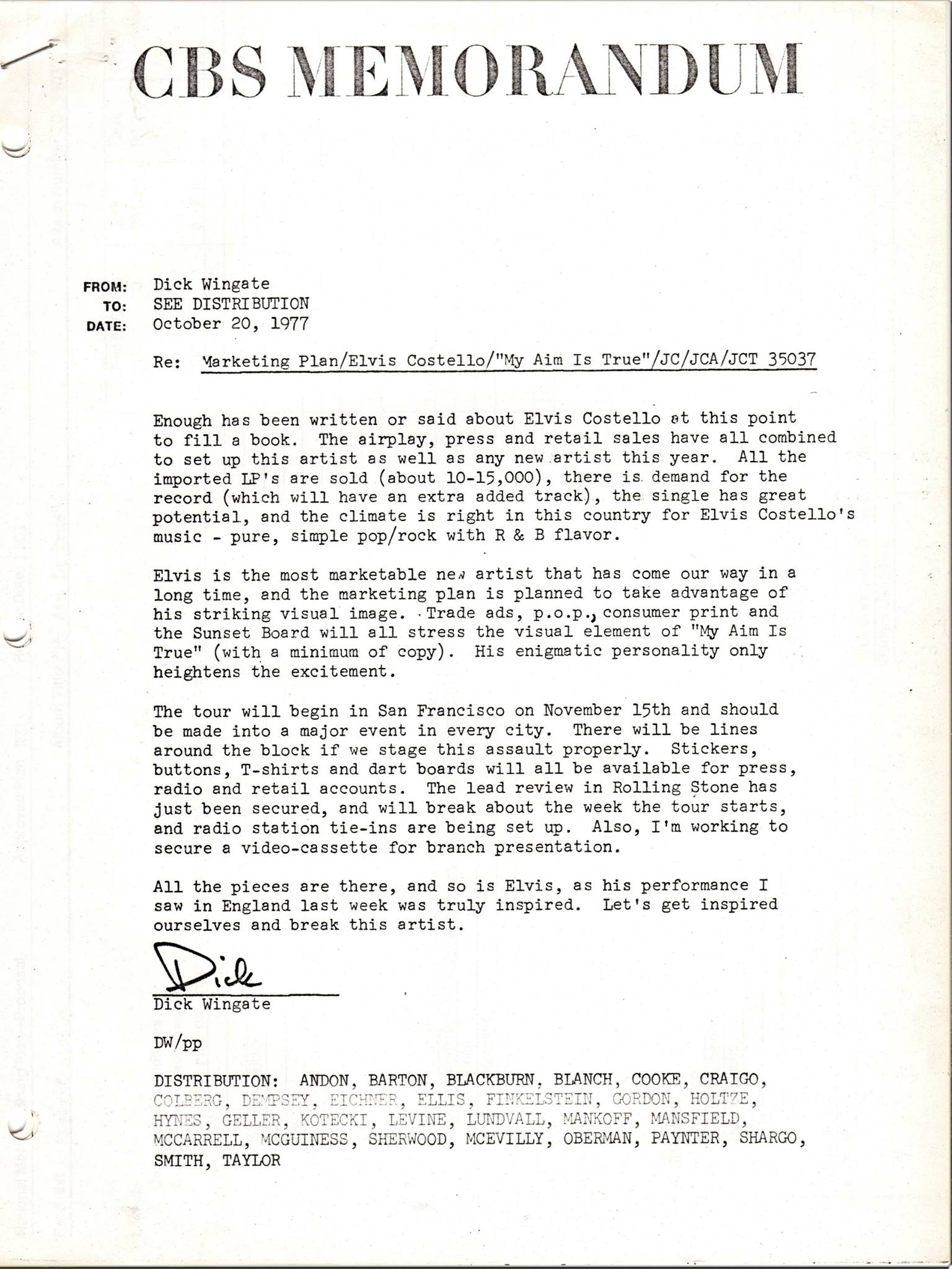 In Wingate’s own words—from his marketing plan for the November 1, 1977 U.S. debut of My Aim Is True that he meticulously has saved for decades—“Elvis Costello is the most marketable new artist that has come our way in a long time.” In his plan, distributed to the label’s senior management and field staff, Wingate noted Costello’s “striking visual image,” adding: “His enigmatic personality only heightens the excitement.”