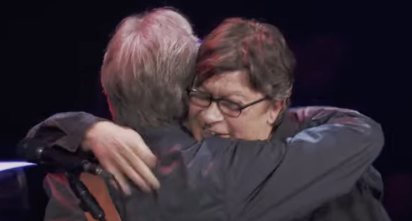 Eric Clapton and Robbie Robertson, following their performance of “I Shall Be Released” at the 2013 Crossroads Guitar Festival
