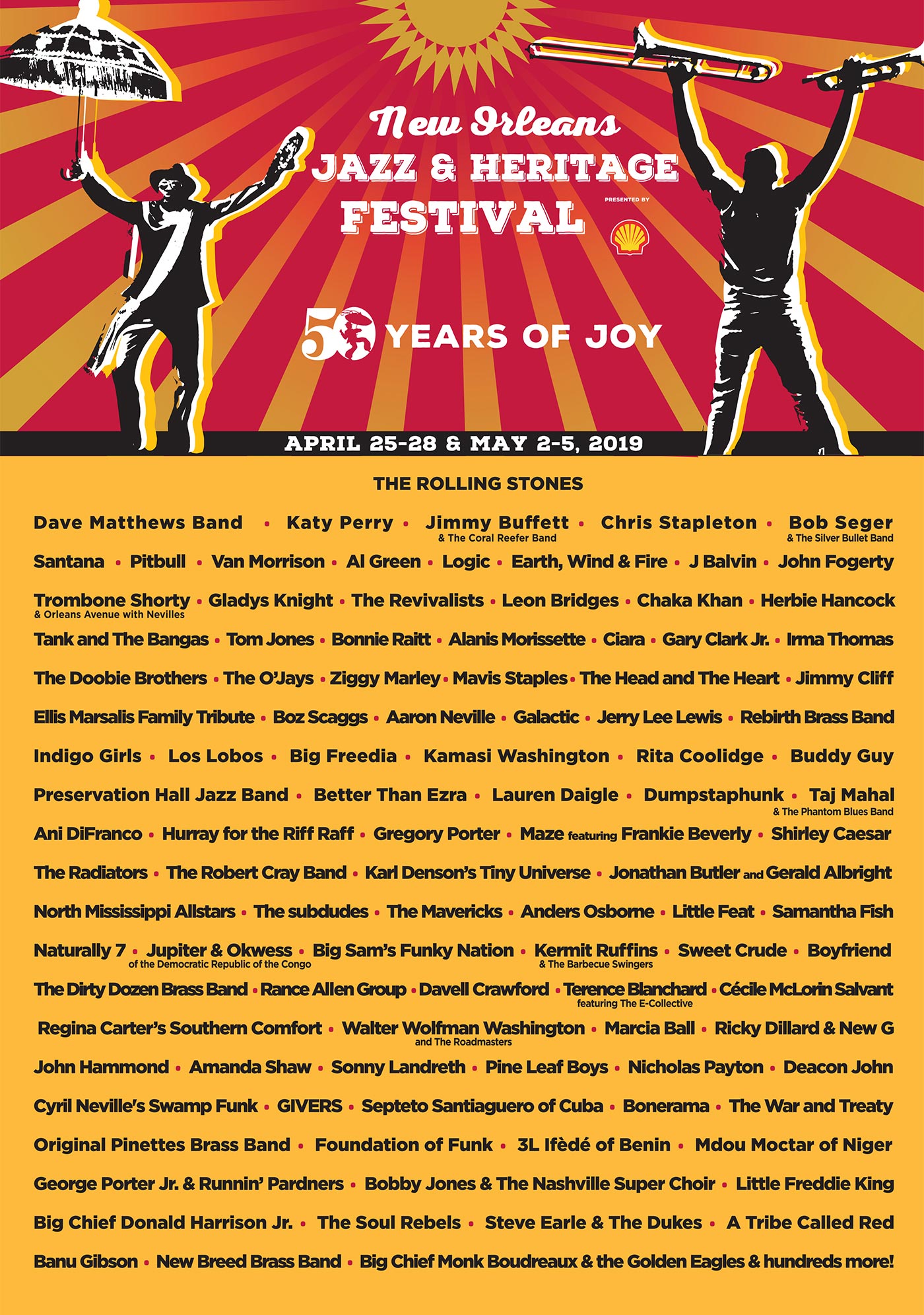 The full lineup for Jazz Fest 2019 was originally revealed on Jan. 15, chock full of classic rock legends over its two lengthy weekends, set for Apr. 25-28 and May 2-5. Also leading the way are the Santana, Van Morrison and John Fogerty.
