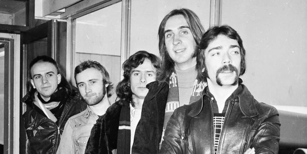 Genesis (from left): Peter Gabriel, Phil Collins, Tony Banks, Mike Rutherford and Steve Hackett at London Airport in 1974.
