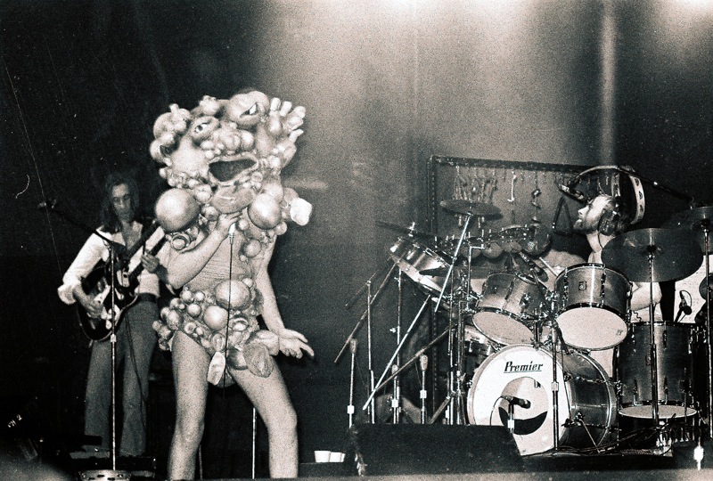 The Lamb stage show utilized eight photo projectors showing over a thousand slides, newfangled lasers and a variety of outrageous costumes for Gabriel, including a glowing suit for “The Lamia,” a lumpy, purposely ugly ensemble with inflatable genitalia for “The Colony of Slippermen” and various masks, which at times interfered with the audience’s ability to hear lyrics. The only official release of a live show from the tour is the Los Angeles Shrine Auditorium Jan. 24, 1975, gig, issued as part of the Genesis Archive 1967-75 box, after being overdubbed and fixed up vocally shortly before Gabriel departed for his solo career.