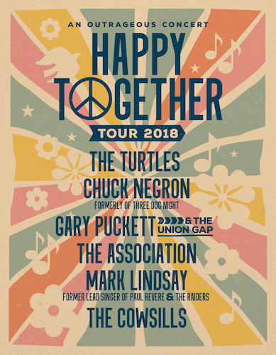 What to do? The thought of the headlining Turtles without Howard Kaylan’s voice might strike some fans as sacrilegious—sort of like seeing the Stones without Mick or the Who without Roger—but it was decided, as Volman relates in the video below, that in the grand tradition of performance, “the show must go on.” So, sitting in for Howard Kaylan on the 2018 run is Ron Dante, best known as the lead voice for the cartoon-rock band the Archies. It was Dante who sang “Sugar, Sugar,” the best-selling hit of 1969, and also Dante who provided the lead vocal on hits by the Detergents (“Leader of the Laundromat”) and the Cuff Links (“Tracy”), and Dante who produced nine albums for Barry Manilow. Dante was recruited to be a Turtle for 2018 so that fans wouldn’t have to miss the Happy Together Tour, which also stars this year The Association, Chuck Negron of Three Dog Night, Gary Puckett, Mark Lindsay of Paul Revere and the Raiders, and the Cowsills.
