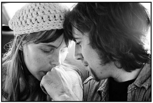 Joni Mitchell and Graham Nash share an intimate moment, comfortable with, oblivious to, or both, their fellow Laurel Canyon musician friend and his camera. They were riding in a limo en route to Big Bear in the mountains east of Los Angeles to shoot the center spread photo for the first Crosby, Stills & Nash album on February 17, 1969. (Photo © Henry Diltz/Henry Diltz Photography. Used with permission)