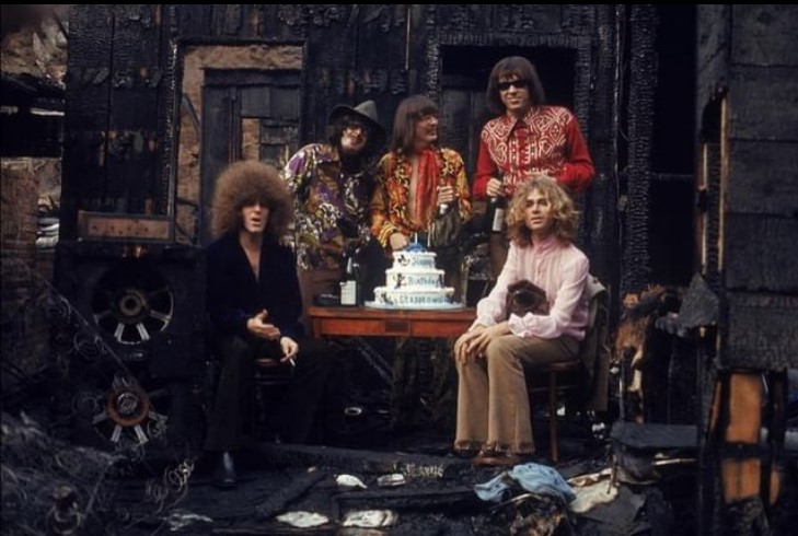 Henry Diltz: “This was a photoshoot with Steppenwolf for their album ‘At Your Birthday Party’ on December 10, 1968. We photographed them in a little burned-down cabin next to Joni Mitchell’s house in Laurel Canyon. Michael Monarch (lead guitarist) couldn’t make it that day, so their producer, Gabriel Mekler (in the hat) stood in for him.” (Photo © Henry Diltz/Henry Diltz Photography. Used with permission)