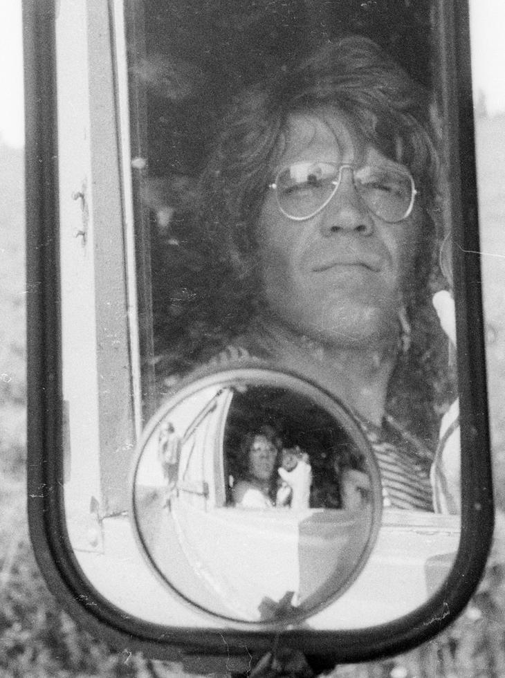 Henry Diltz shoots his reflection(s) in a vehicle’s rearview mirror at Woodstock, August 7, 1969. (Photo © Henry Diltz/Henry Diltz Photography. Used with permission)