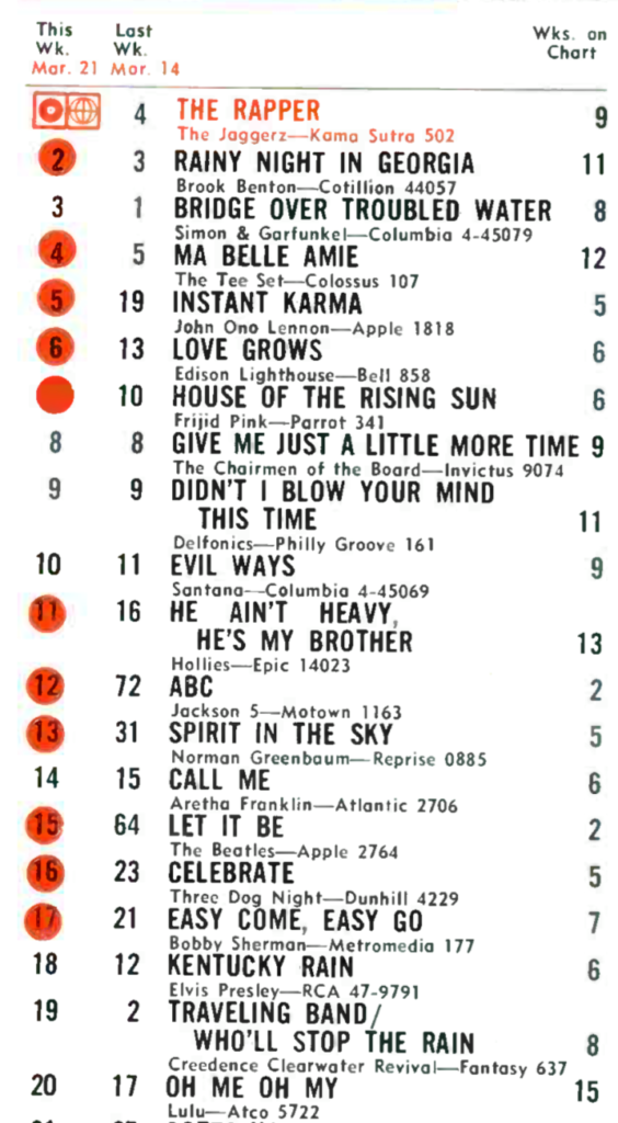 The Jaggerz’ “The Rapper” rocketed to the #2 spot on the Billboard singles chart in early 1970 and to #1 on the March 21 Record World chart, outpolling the Beatles, Simon and Garfunkel and others.