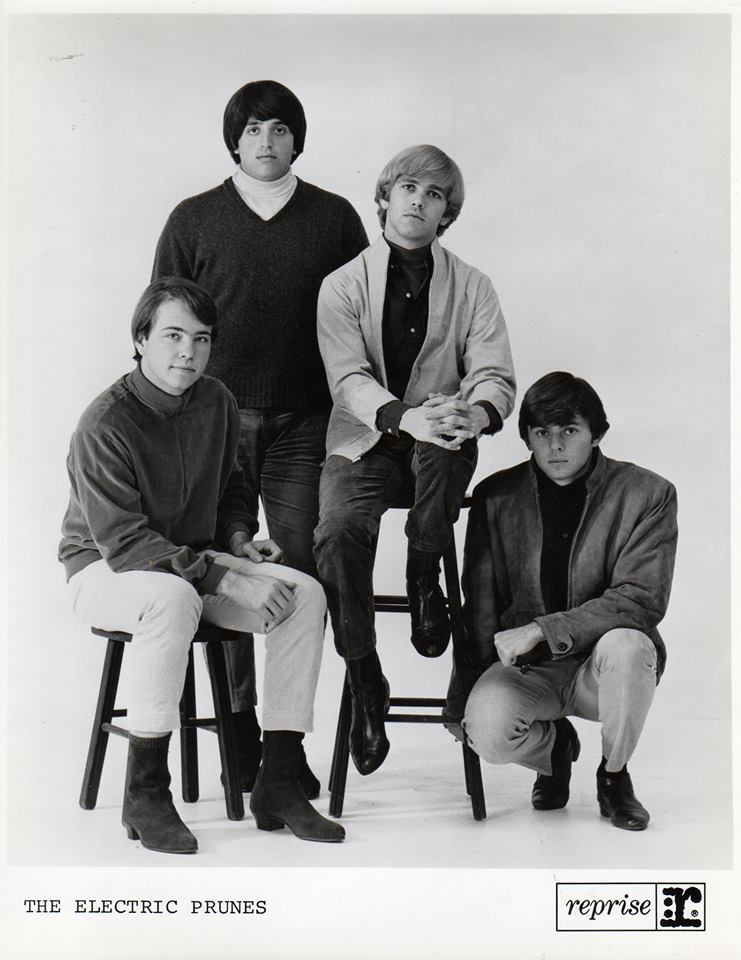 An early Reprise Records publicity photo of the Electric Prunes. Lowe is second from top, sitting on stool.