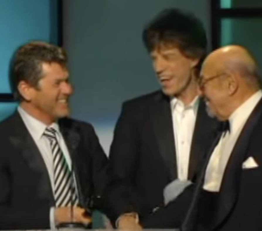 Jann Wenner, at his own induction into the Rock & Roll Hall of Fame in 2004, with Mick Jagger and Rock Hall Foundation founder Ahmet Ertegun