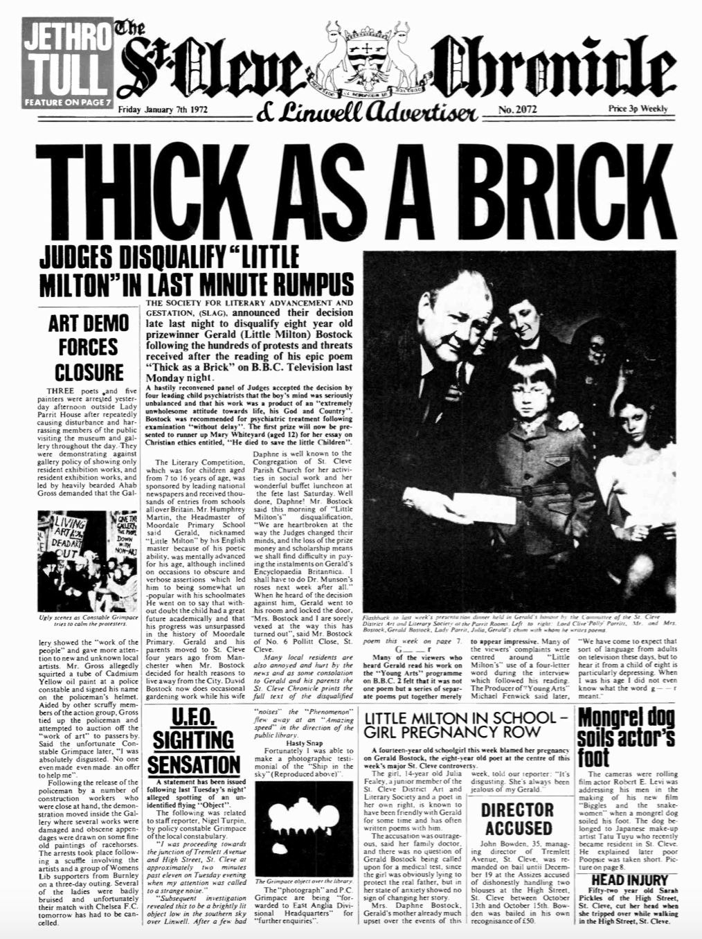 Thick as a Brick is multimedia circa the Stone Age, music married to a newspaper. The album’s sleeve was printed as a custom (and wholly fictional) 16-page paper, the January 7, 1972, edition of The St. Cleve Chronicle & Linwell Advertiser. Anderson drove its articles as personally as he did the vinyl’s contents, writing most with help from Tull keyboard player John Evan and bassist Jeffrey Hammond. Its primary feature is the story of eight-year-old boy Gerald (Little Milton) Bostock, who, after using inappropriate language on BBC Television, is stripped of a poetry award and declared to possess an “extremely unwholesome attitude towards life, his God and Country.” The unsuitable poem, printed on page 7, is the album’s lyrics.