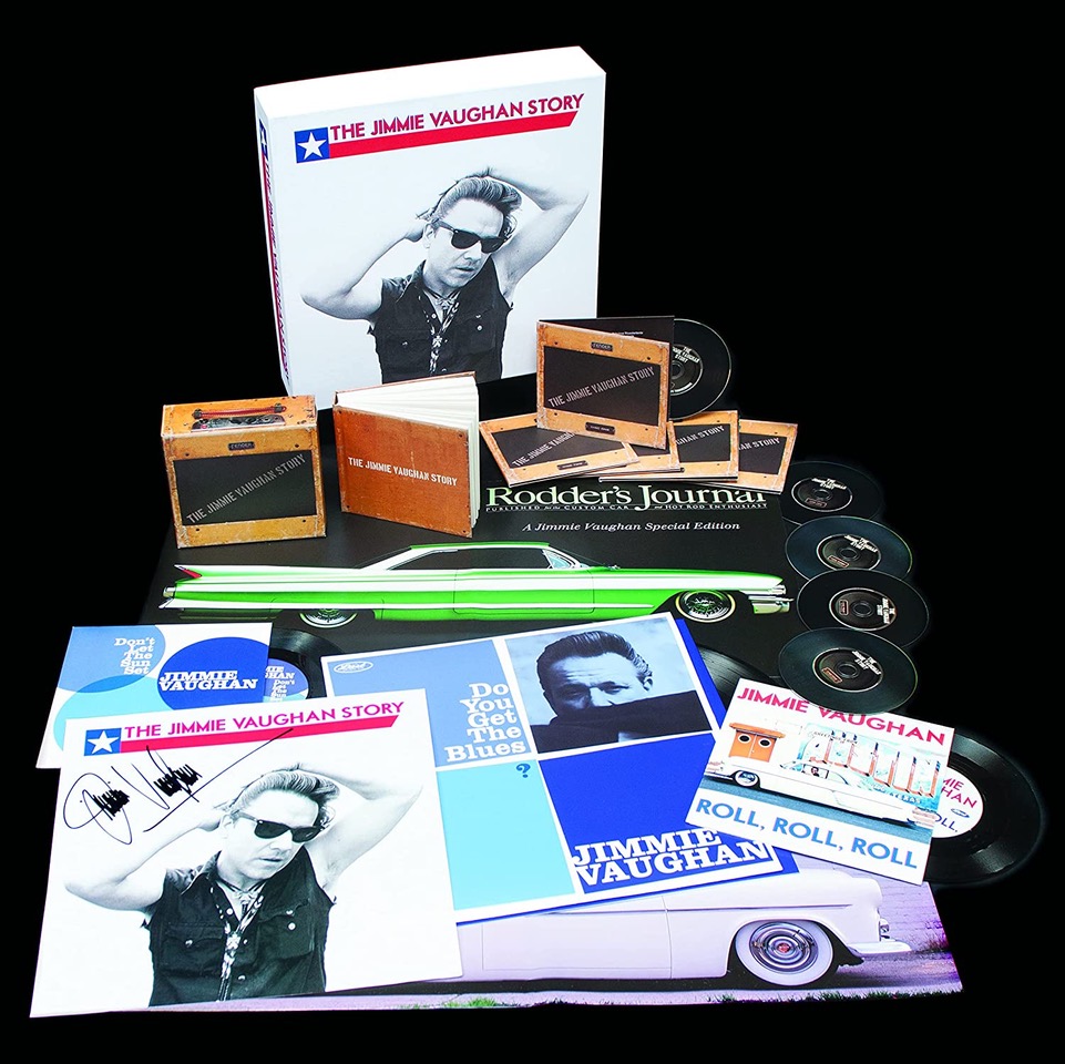 Texas-based blues-rock singer and guitarist Jimmie Vaughan marked his 70th birthday this year, and we get the present (even if we do have to pay for it): a limited-edition boxed set (due out September 17, 2021), titled The Jimmie Vaughan Story, that includes six hours of music on five CDs, plus a 240-page hardcover book. A beautifully packaged deluxe version adds more goodies, among them a vinyl copy of Vaughan’s Grammy-winning 2001 album, Do You Get the Blues, a couple of 45-rpm singles, a magazine that showcases the artist’s classic cars collection, and an individually autographed replica of the album cover.